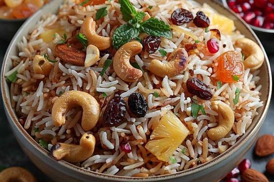 Start by soaking and cooking basmati rice until nearly done. Fry cashews, almonds, and raisins in ghee, followed by caramelizing onions. Saut whole spices like cumin, cardamom, cinnamon, and cloves in ghee, then add the cooked rice. Mix in fried nuts, raisins, caramelized onions, and optional fresh fruits like pineapple and pomegranate. Steam the mixture on low heat for a few minutes to enhance flavor. Garnish with fresh mint or coriander and serve warm.