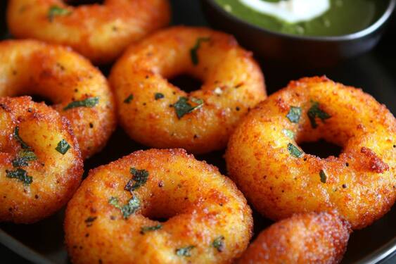 Medu vada is a classic South Indian dish made from soaked urad dal that's ground with green chilies, ginger, garlic, and curry leaves.The batter is seasoned with spices and sometimes mixed with chopped onions for added flavor. It is then allowed to rest, enhancing its light and fluffy texture. Each vada is shaped into a disc with a central indentation to ensure even cooking. Deep frying in hot oil until they turn golden and crispy is key to their perfect texture. Serve immediately with coconut chutney, sambar, or your favorite dip for an authentic taste.
