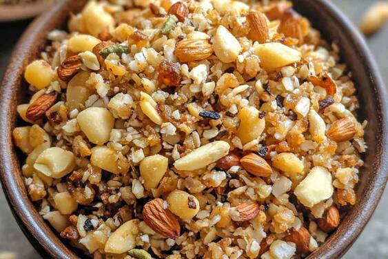 Panjiri is a nutritious North Indian sweet made with wheat flour, ghee, and a mix of roasted nuts, edible gum, fox nuts, and desiccated coconut. The flour is roasted in ghee until golden, giving it a nutty aroma. Crushed gond, roasted makhana, and nuts are blended with powdered sugar and cardamom for a flavorful treat. It's rich in energy, perfect for winters or postnatal care. Adjust sweetness and add seeds like flax for extra health benefits. Panjiri can be stored for up to two weeks, making it a convenient and wholesome snack.