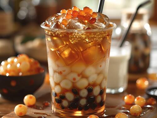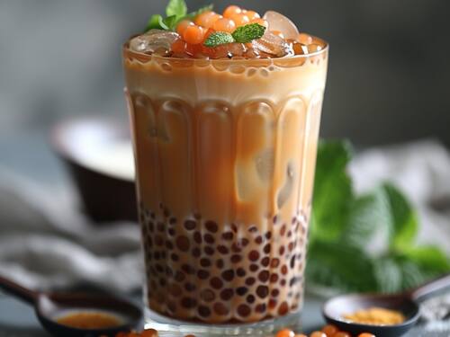 Bubble tea is made by cooking tapioca pearls, brewing strong tea, sweetening it, and mixing it with milk. The refreshing drink is served cold with chewy pearls.