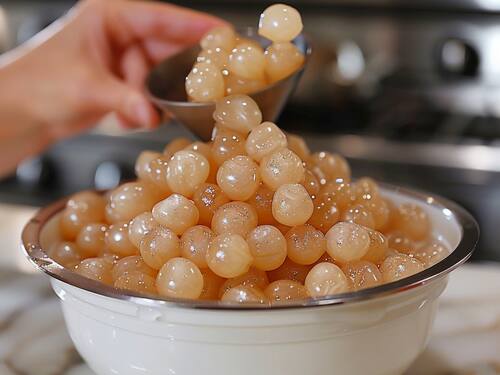 Mix the Drink: In a glass, add a few spoonfuls of tapioca pearls, followed by ice. Pour the cooled tea over the ice, then add milk or a milk alternative.