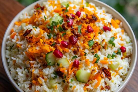 Thayir Sadam, or Curd Rice, is a traditional South Indian dish known for its cooling and digestive benefits. It is made by mixing soft-cooked rice with fresh curd, a bit of milk (optional), and salt for a creamy texture. A flavorful tempering of mustard seeds, green chilies, ginger, curry leaves, and hing enhances its taste. Additional ingredients like grated carrots, pomegranate seeds, or cucumber can be added for extra crunch and freshness. It is best served chilled or at room temperature, making it a perfect dish for hot weather. Enjoy it with pickles, papad, or a drizzle of ghee for a comforting meal.